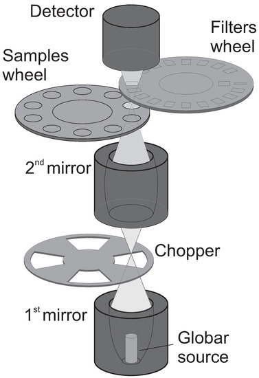 The apparatus works vertically, a small hot black body (globar) is the source placed on the first focus of one ellipsoidal metal on-axis mirror, a second mirror collects the radiation on the sample. The filters and the pyroelectric detector are a few mm above, on the same optical line. The whole optical length is approximately 12 cm. In some measurements, we used a third mirror to better focus the signal on the pyroelectric detector: this causes an increase in the total optical length and this addition was only made when necessary as the optical path should be kept as short as possible to reduce the absorption from the atmosphere.