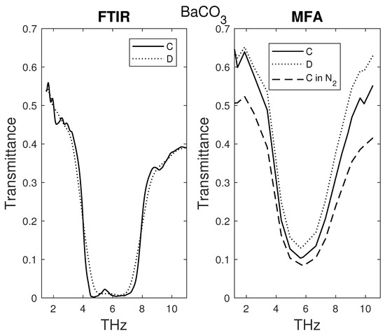 FTIR, having a very good optics, has a spot size smaller than the one of MFA; only if the powder is uniformely distributed on the support, the two measurements can be equal; if the sample, as it often happens, is not perfectly uniform, the investigated areas are a priori different. The sample thickness is inferred from its weight: then, if the sample is not uniform, we can have a more pronounced difference on measurements of supposed different thicknesses made with MFA compared with FTIR measurements. The frequency resolution of the FTIR is about 0.03 THz, that one of MFA is about : that means 1.5 THz at 10.5 THz and 0.16 THz at 1.1 THz. For all these reasons, our target is just a qualitative agreement of the measurements in both instruments; of course, FTIR, having a better resolution, can detect absorption features non detectable by MFA.