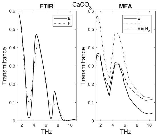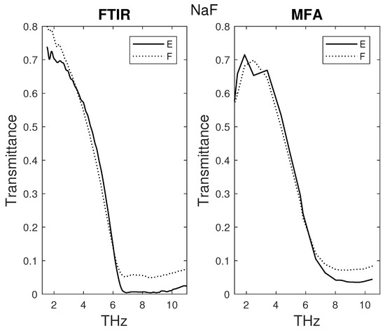 m. The absence of the absorption at 7.5 THz in the MFA measurements is due to the fact that its bandwidth is too wide to discriminate small features. Additionally, in this case we made a measurement in pure Nitrogen: there are no significant differences with the measurement in air. The difference in amplitude between the samples E and F is more pronounced in MFA measurements compared with those of FTIR probably because MFA spot size is larger and it mediates on both whole samples.