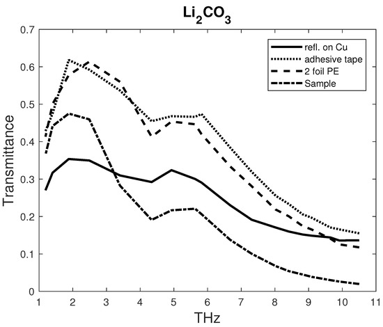 dotted line: we used a common adhesive tape, that is usually almost transparent at THz, as support and simply brushed some powder on the glue of the tape;