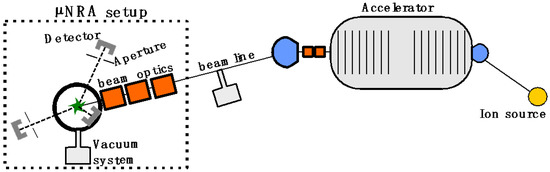 Sketch of the µNRA setup with the required modules and the target (green star) attached to a tandem accelerator. Blue objects depict dipole magnets. Orange squares depict ion beam focusing devices.