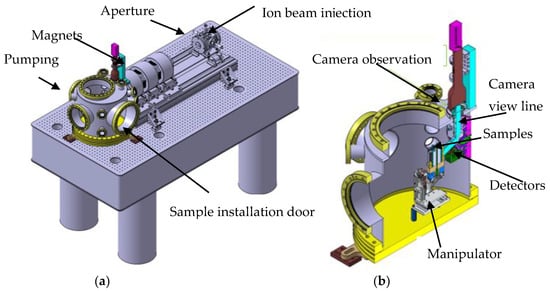 CAD drawings of the µNRA setup (dotted square in Figure 1). (a) The µNRA vacuum chamber (flanges in yellow) together with the three focusing magnets and an aperture on a vibration-damping table. (b) Detailed crosscut of the vacuum chamber with sample manipulator, observation, charged particle detectors, and holder.