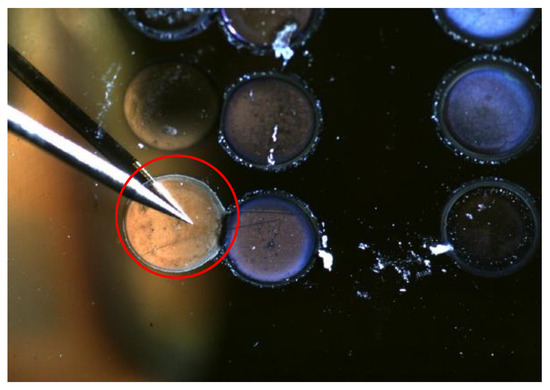 Camera sample image of an in-situ contact of an all-solid state lithium thin-film battery (red circle) using a W contact needle (silver part on the left) attached to an isolated 2 pole DC feedthrough (not shown) with an outside cell tester. The cell to source wiring accounts to 1 Ω DC resistance.