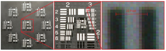The tele-centric camera setup is first calibrated in a test stand with the help of a standardized vacuum compatible test pattern also used for the later beam resolution tests (Figure 4). The best spatial resolution was found by varying the angle of incidence, lens aperture, the test patterns location in the camera field of view, the test patterns lighting, the lens aperture opening, and the distance between lens front and test pattern. The distance between two line centers on the test pattern compared to the number of pixels between two lines, yields the pixel width calibration, as shown in Figure 4. Ten different groups are investigated with variations from 5.521 µm/pixel to 5.861 µm/pixel. On average, a pixel corresponds to 5.71 ± 0.12 µm, compared to nominal calibration of 5.5 µm/Pixel according to the datasheets. A change of the test patterns location in the camera field of view had no influence on this calibration, proving the lens’ tele-centricity.