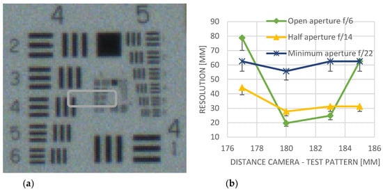 (a) Detail of the USAF 1951 test pattern with f/6 aperture. In the best case, the lines of the fifth element of the fifths group (box) can be separated, giving a spatial resolution of 19.7 µm. (b) Resolution with respect to aperture and working distance.