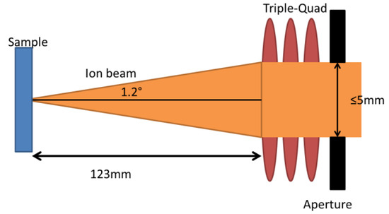 Since the micro-focus in this setup is necessarily connected to a convergent beam, an angular spread of the impacting ions of up to 1.2° is present for the maximum specified demagnification and a 5 mm aperture, see Figure 6. This geometrically induces ranges of probing depth and energy-loss of the projectiles in the target. Typically, smaller apertures and less demagnification is required for the investigated samples resulting in values of ≤0.3° for most cases. This value and the resulting loss of energy resolution is negligible compared to the geometrical straggling induced by the finite detector’s width.