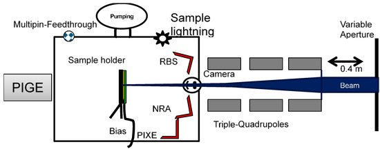 A micro-beam has to provide a maximum ion current at a minimum beam diameter for high lateral resolution ion-beam analysis. For this purpose, beam focusing and beam apertures are required. The Quadrupole triplet consists of three OM-56 type magnets from the manufacturer Oxford Microbeams Ltd. (Oxfordshire, UK) with 10 mm bore and 100 mm length per magnet. The triplet is set at 123 mm distance between the last magnets iron core and the sample (see Figure 6). The magnets have a maximum field at the pole tip 0.4 T. They can be aligned with 1 µm precision. The beam current is specified to 0.6 nA for a spot size of 1 µm at a distance of 170 mm between last magnet and target by the manufacturer of the magnets. Practically, detection limits and accuracy for sub-µm depth resolution requires ion currents >0.1 nA in order to achieve sufficient counts within measurement times in the order of hours which can be provided by the magnetic focusing system.