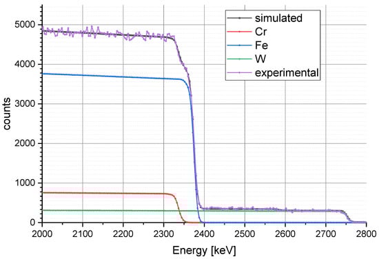The setup contains in total four detectors as depicted in Figure 7. For charged particle detection for nuclear reaction analysis (NRA) and backscattering spectrometry (RBS and EBS), two silicon detectors are installed at reaction angles of 150 ± 2° for separating different particle species. The detector surface has a distance to the analysis/beam spot of 32.5 ± 0.5 mm. Light induced noise in the detectors is avoided by a full coverage of all windows during measurement. A high-resolution detector with 11 keV FWHM at 1.6 µs rise-time (or 16 keV at 0.6 µs), 50 mm² size, and 100 µm nominal active thickness detects the full energy of protons up to about 3.3 MeV and α’s up to about 13 MeV. Figure 8 shows the excellent resolution of this detector via the separation of Fe and Cr signals in a steel. The actual thickness of this detector is around 300 µm as full energy measurements of 6 MeV protons from NRA reactions suggest. The second detector has a 1500 µm nominal active thickness, 150 mm² size, and 22 keV FWHM resolution at 1.4 µs rise-time. This detector is equipped with a stopping foil of Polyimide of 25 µm thickness coated with 30 nm Al to block incident light and α-particles below about 5 MeV. Both detectors can be equipped with 2 mm thick steel apertures in the shape of a segment of the 150° circle to adapt count rates and limit geometrical straggling. The effective detector solid angle ratio between both detectors and different aperture options are experimentally calibrated using simultaneous acquisition of the 7Li(p, α)4He reaction signal of a thin lithium containing film on a silicon substrate to an accuracy of 1% (>10,000 counts) for all cases with e.g., 3.52 ± 0.04 times reduced solid angle for a 1.5 mm aperture on the high-resolution detector and an open thick detector. The connected RC pre-amplifiers limit the usable count rates up to a few 10,000/s with significant degradation of energy resolution at higher values.