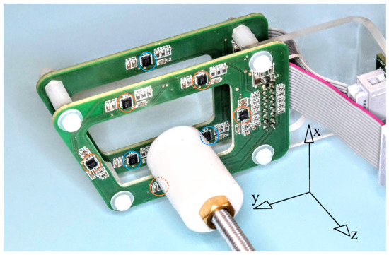 The sensor array contains 8 sensors distributed on two parallel PCBs (three of them, highlighted with blue circles are a and other five (orange circles) at mm). The system is designed for eye-tracking purposes. A 20 mm diameter cylinder is used to emulate eye motion. It hosts the magnetic source (target), which performs either circular or helix trajectories.