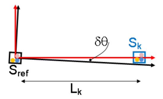 One of the possible imperfections is related to the limited precision with which the sensor positions are known. Firstly, each chip contains three separate magnetoresistive sensors (represented with dots in Figure 2) for the measurement of the three field components, and they are not located in one point within the chip. This limit could be (at least partially) mitigated assigning the precise locations; however the relative displacements are sub-millimetric and do not play a substantial role, unless the system to be built is scaled down to sub-centimetric size. Secondly, there could be a misalignment between the co-ordinate axes within the reference sensor (that used to define the field components) and the PCB reference frame (that used to define the positions of the other sensors with respect to the reference one). As schematically shown in Figure 2, an angular misalignment would produce systematic errors in the determination of the kth sensor position, being its distance from the reference one. The problem is 3-D and three angular uncertainties concur to determine the sensor position errors. In our implementation the are in the cm scale, and might be of the order of one-degree, which leads—again—to submillimetric errors. Additional (but even smaller) uncertainties are related to minor chip translations with respect to their ideal positions on the PCB.