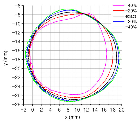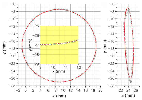 Figure 3 shows its and projections, together with best-fitting curves based on an elliptical model. A 8P tracking is applied, where is previously estimated as the mean value on the whole trajectory reconstructed by a 9P one ( μAm). The 9P result (not reported) is indistinguishable in the projection and worse in the one. The latter is a typical behavior, and there is evidence that a less accurate tracking is obtained—particularly with 9P—along the direction perpendicular to the dipole (z in the present case, the dipole being radially oriented). The elliptic fit enables an estimate of the major axis (19.9 mm), which matches the cylinder diameter within a 0.1 mm accuracy.