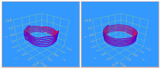 A more complex trajectory with 3D reconstruction permits performance evaluations that are qualitative, but—nevertheless—significant. To this aim, we apply 3D trajectories to the target magnet. In this case, the magnet holder is mounted on a screw-axis, with a 1 mm pitch thread. The trajectory has consequently an helix shape, 20 mm in diameter and 1mm in pitch. The sample 3D trackings shown in Figure 4 represent the reconstructed trajectories obtained on the basis of a 9P and 8P, respectively. Furthermore, in this case, the dipole is radially oriented. The 9P produces evident distortions, particularly due to undesired fluctuations of the z co-ordinate. Remarkably, these z distortions occur simultaneously with unexpected variations of the m estimates. This feature is likely due to the imperfections mentioned in Section 3.2. The 8P greatly helps improve the reconstructed trajectory in this respect.