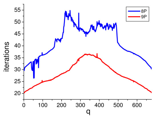 Average iteration number as a function of the guess accuracy for the 8P (blue) and 9P (red) cases. The cases with q = 1 and q = 670 correspond to using one of the nearest neighbors as an initial guess, while q = 335 corresponds to using diametrically opposite points.