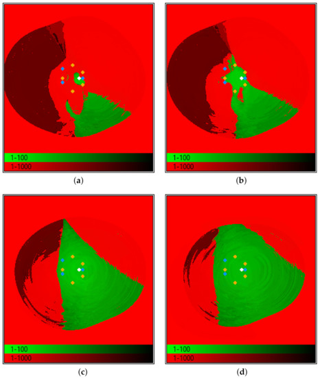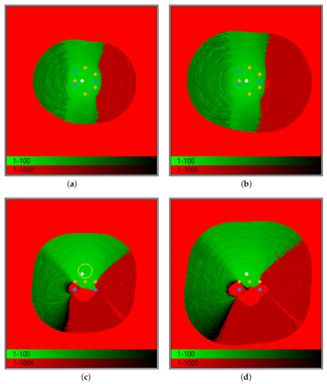 2D convergence maps of sections. The and guess is set at the default, and the z guess is variously assigned: from 8 mm (a), to 20 mm (b), 60 mm (c) and 80 mm (d). The 40 mm case was already shown in Figure 8b.