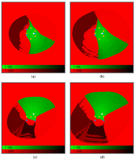 A hint for an appropriate selection of z, is suggested by the maps represented in Figure 9. This figure represents a convergence maps obtained when the dipole is located peripherally (the same as for Figure 8), the and guesses are assigned their default values, while z co-ordinate is varied (details provided in the caption). As Figure 7c,d and Figure 8c,d suggest, excessive z values may lead to bad convergence, however intermediate values (e.g., z = 60 mm to 80 mm) produce—with a larger number of iterations—a wider convergence area in the section. In contrast, wrong z (Figure 9a) and small z (Figure 9b) may reduce dramatically the convergence region.