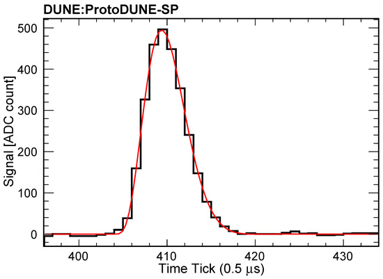 where S is the DAC setting (0–63) and the step charge = 3.43 fC ∼ 21,400 electrons, which is roughly equivalent to the charge deposition of a minimum ionizing particle traveling parallel to the wire plane and perpendicular to that plane’s wire direction on a single wire. The charge calibration is expressed as a gain for each channel, normalized such that the product of the gain and the integral of the ADC counts over the pulse (pulse area A) in a collection channel gives the charge in the pulse, i.e., . Figure 1 shows the response of the ProtoDUNE electronics to an input charge of DAC setting 3.