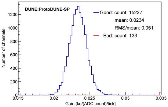 Figure 3 shows the distribution of these gains for all channels. Channels flagged as bad or especially noisy in an independent hand scan are shown separately. The gains for the remaining good channels are contained in a narrow peak with a root mean square (RMS) of 5.1%, reflecting the channel-to-channel response variation in the ADCs and the gain and shaping time variations in the amplifiers. The relatively large spread is a feature of the ADC used in ProtoDUNE. The final electronics design for DUNE is expected to have a smaller channel-to-channel response variation.