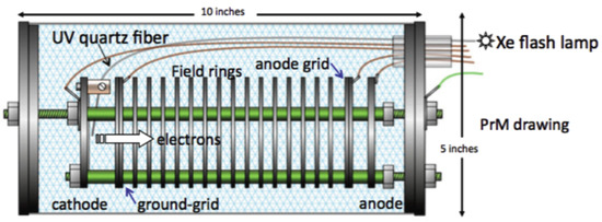 The drift electron lifetime can be measured using the purity monitor [16,23,24,25,26]. A purity monitor is a double-gridded ionization chamber immersed in the liquid argon volume, as shown in Figure 6. The fraction of electrons generated via the photoelectric effect by the Xe lamp at the cathode that arrive at the anode after the electron drift time, t, is a measure of the electronegative impurity concentration and can be interpreted as the electron lifetime, , such that