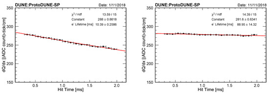 Plot of the most probable value of the distribution in ProtoDUNE as a function of the hit time, fit to an exponential decay function during a period of lower purity (left: = 10.4 ms) and during a period of higher purity (right: = 89 ms). This figure is from [2].