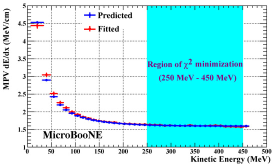 There are generally two steps in converting the measured raw ADC counts into energy. The first step is to convert (ADC/cm) into (e/cm). This step employs the measured electronics gain and removes effects that cause non-uniformities in the detector response, including the space charge effects and the free electron attenuation. The second step converts (e/cm) into (MeV/cm) using either the Birks or modified Box recombination model. However, there could be uncertainties in each step of calibration that affect the final calibrated quantity. One can introduce a calibration constant to correct the calibrated charge. This calibration constant is a scaling factor that applies to (e/cm), which can be fine-tuned using the stopping muons. The kinetic energy of the muon at each track hit can be determined by the residual range. A portion of the track can be selected that corresponds closely to a minimum ionizing particle, for which is very well theoretically understood to be better than 1%. The calibration constant ensures that the measured agrees with the prediction made by the Landau–Vavilov function [43] for the minimum ionizing particles. Figure 8 shows the measured values in MicroBooNE data after tuning the calibration constant, which shows a good agreement with the prediction in the region of kinetic energy between 250 and 450 MeV. This universal calibration constant can be used to calibrate the detector response to all particles.