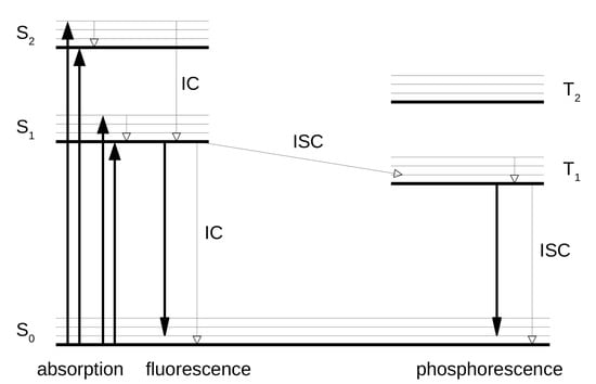 Jablonski diagram, explaining photophysical processes in molecular systems. Empty arrows denote non-radiative transitions: vibrational relaxation, internal conversion (IC) and intersystem crossing (ISC), see [24].