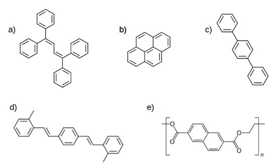 Chemical structures of wavelength shifters relevant for liquid argon detectors: (a) 1,1,4,4-tetraphenyl-1,3-butadiene (TPB), (b) pyrene, (c) p-terphenyl, (d) 1,4-Bis(2-methylstyryl)benzene (bis-MSB), (e) polyethylene naphthalate (PEN).