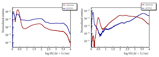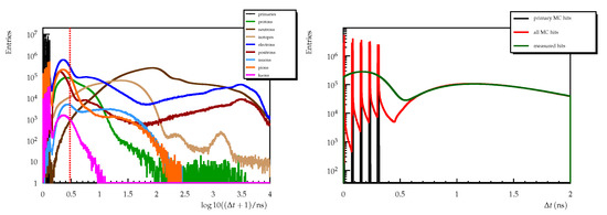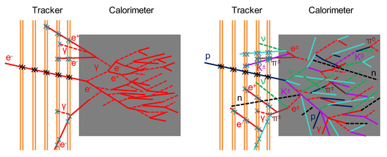 - improved e/p identification. The presence of low-energy (i.e., ) back-scattered hadronic particles from a shower identifies the primary CR as hadron. Separating electrons, positrons and photons from the overwhelming background of protons that constitute the 90% of the CCR composition is a major requirement for most CR experiments. An innovative use of the accurate timing measurement in tracking detectors upstream of the calorimeter for this purpose was recently proposed [55] (Figure 1): the back-scattering of an electromagnetic shower is made of ultra-relativistic particles, even for very low energetic primaries. The detection of very delayed hits from slow back-scattered particles is a clear signature of an hadronic component in the shower, strongly suppressing the likelihood of an electromagnetic shower in the calorimeter.