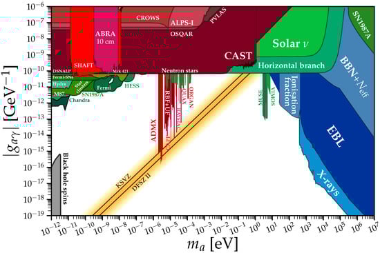 Most of the experiments are sensitive to the axion–photon coupling constant , which is proportional to the axion mass . The region of interest for QCD axions is the yellow band in the - plane shown in Figure 1.