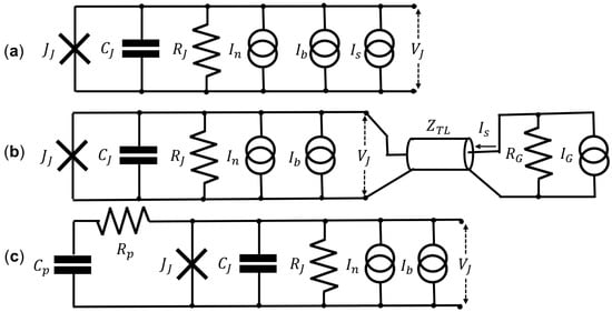 (a) An electrical model of a JJ with intrinsic and external current sources. (b) An electrical model of a JJ attached to a transmission line. (c) An electrical model of a JJ with a parasitic RC load.