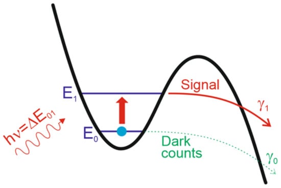 is the switching rate of the excited JJ to the resistive state. Perfect matching condition implies that the escape to the resistive state must be as fast as the relaxation of the junction to the ground level. This prevents us from using MQT transitions from the first excited level as a detection mechanism: an escape caused by MQT from the first excited level, in Figure 3, equal to 1–10 GHz, would induce a dark-count rate due to escape from the ground level of about 1–10 MHz. On the contrary, while keeping low dark-count rates, two or more photons may induce the escape if absorbed by the junction within the relaxation time .