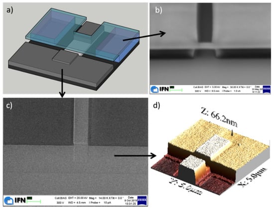 (a) Schematic image of the shadow mask evaporation technique. The copolymer/PMMA bilayer was exposed by EBL and developed, in order to obtain a self-standing bridge of the desired geometry, as shown by the scanning electron microscope (SEM) micrograph in (b). A two-angle evaporation with an oxidation step in between defines the junction geometry (light and dark gray in (a). (c) SEM micrograph of the junction after the lift-off process used to remove the bilayer mask. (d) An atomic force microscope (AFM) characterization of a typical junction.