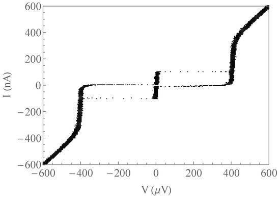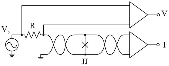 is the maximum Cooper pair current that can flow through the component, and ℏ and e are the reduced Planck constant and electron charge, respectively. A stationary phase, and correspondingly, a zero average voltage is possible, according to the Josephson equations, Equations (1) and (2), when a dc current below flows in the element. Depending on the values of the junction parameters (), a finite-voltage state is also possible. If the dc bias current overcomes , the phase cannot be stationary and a finite-voltage state is the only possibility. From the experimental point of view, this behavior is reflected in the occurrence of hysteresis in the current–voltage characteristic of the JJ, for certain dc bias current intervals, where two voltage states (zero and finite-valued) can be observed. Such hysteresis is at the basis of the use of a JJ as a detector. It is worth noting that in a typical tunnel-type JJ, the resistance of strongly depends both on voltage and temperature. However, as the overall effect of the resistor is to introduce dissipation in the system, its nonlinearity is often not considered in the presence of moderate or weak damping. Another important effect of the quasiparticle current, modeled by , is the presence of random charge fluctuations, which can be represented, using the fluctuation dissipation theorem, by a noise current source, indicated with in Figure 2, whose spectral power density is assumed to be frequency independent (Johnson noise) [53].