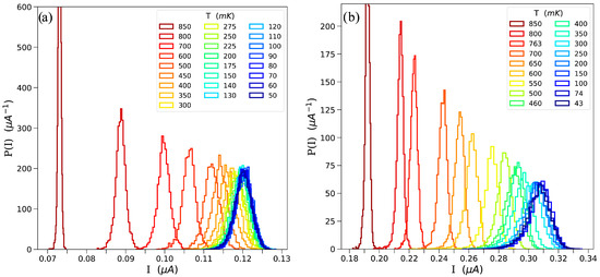 From the 5000 transition values we constructed escape-probability densities. Before doing this, we applied a fast Fourier transform to the measured series and identified a narrow peak at 100 Hz and minor peaks at lower frequencies, attributed to electronic noise in the current-measurement setup. We calculated the peaks’ frequencies, phases, and amplitudes from the Fourier analysis, and filtered out the noise from the original series. We thereby obtained a 20% improvement in resolution. We show the experimental switching distributions obtained after filtering the data for each temperature in Figure 7a,b—the smallest and the largest junctions, respectively.