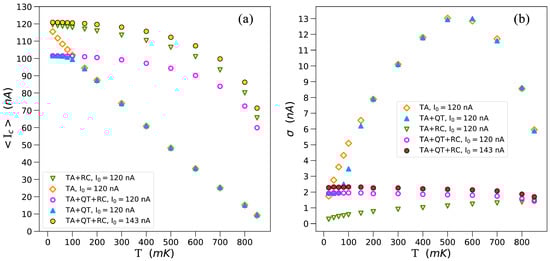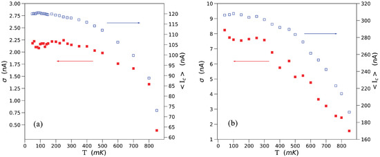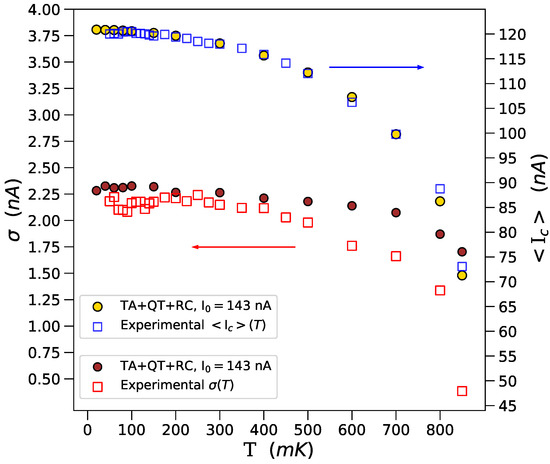 The mean critical current values (empty blue squares) follow qualitatively the typical BCS behavior [52] as a function of temperature. The widths (full red squares) present a peculiar feature. The constant behavior of at low temperatures was expected from quantum tunneling processes (Equation (4)), whereas its decrease at higher temperatures, above about 400 mK, suggests that TA (Equation (3)) is suppressed. We attribute the decreasing regime partially to the decrease of the critical current with increasing temperature, although a further contribution due to retrapping is not excluded.
