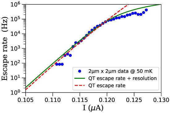 Finally, we investigate the dark-count rate performances of the junction to predict how it would behave if used as a single photon counter. Following [69], we calculated the escape rate from the current distribution of the JJ taken at the lowest temperature (50 mK). The result as a function of the bias current is shown in Figure 11, where the blue dots represent the escape rate values extracted from data. The dashed red line is the escape rate expected from MQT only. It reproduced the data for currents up to 120 nA, where the current distribution at 50 mK has its maximum (Figure 7a). The deviation at higher currents is attributable to a Gaussian resolution effect with standard deviation nA, as confirmed by the data’s agreement with the green solid line obtained by applying such a smearing to the theoretical current distribution of the MQT before deriving the escape rate.