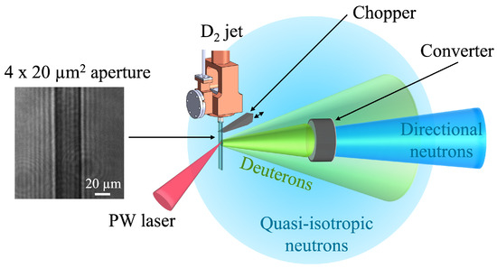 Essential to the setup are the short-pulse, high-repetition-rate petawatt (PW) laser, the cryogenic liquid deuterium pitcher for ion acceleration, and the catcher for ion-to-neutron conversion. The combination of the high-shot-rate laser with the quickly replenishing target allows for operation at rates exceeding 1 . A schematic of the setup is shown in Figure 1. It was designed to maximize the flux delivered in directional, high-energy neutron beams. First, experiments using this platform were successfully conducted at the single shot Texas Petawatt Laser facility [45]; see Section 7.