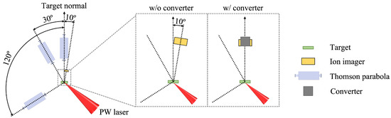 After completion of the initial characterization of the accelerated ion beam and the implementation of the converter, the diagnostics presented here monitor the ion acceleration efficiency and performance by comparing beam parameters to previously obtained references. To make the setup displayed in Figure 2 compatible with the converter implemented in the target normal direction, a small hole ( ) can be drilled along the axis of the converter to enable the continued measurement of the ion spectrum. The ion imager is placed around the converter to track the lower-energy part of the directional ion beam.