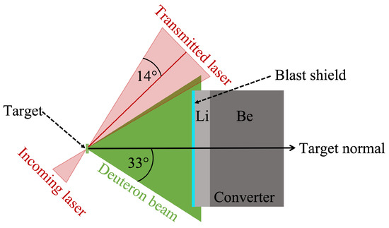A compromise between maximizing the total number of ions captured by the converter and minimizing the potential damage by laser light can be found by placing the converter close to the pitcher and still outside the transmitted laser light. A blast shield that will deflect away any incident scattered laser light is added to the front of the converter. It consists of a No. 1.5 borosilicate glass microscope cover slip (170–250 thick) with a 40 thick aluminium coating. This allows the distance between pitcher and converter to be reduced to around 5 , depending on the laser intensity on target and the focal length of the final focusing optic. At this distance, the covered half opening angle is 14, fully capturing deuteron energies above approximately 30 MeV. Ions with lower energy will not all be captured by the converter and will produce neutrons upon interacting with either the chamber wall or other components in the target chamber.