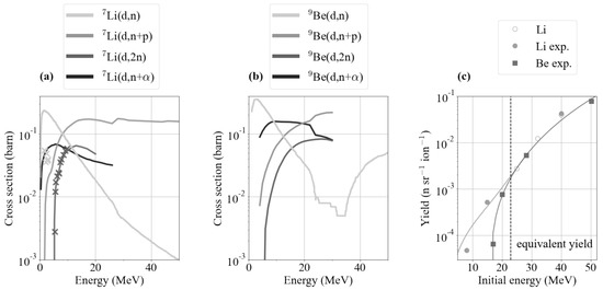 The deuteron elastic breakup cross section has not been studied in great detail in the energy ranges of interest for laser-driven neutron generation, but it is on the order of 100s of for energies above 10 for both lithium and beryllium [77,78]. Neutron generation cross sections of fusion reaction channels, such as (d,2n) and (d,n+), for lithium and beryllium attain maximum values of tens of [79,80]. The cross sections of the most important neutron-generating interactions of deuterium with lithium and beryllium are displayed in Figure 4. Interaction cross sections for deuterium with beryllium, such as (d,n+t), are not shown in this plot as they are lower by one order of magnitude compared to the displayed cross section and are thus neglected during further considerations. Experimentally measured interaction cross sections are depicted by crosses in the plot, confirming simulated neutron production cross sections. Lithium shows four different reaction channels that are dominant in different energy ranges. The Li(d,n) (stripping) reaction shows a high reaction cross section for energies ranging from to [81]. For higher energies, deuteron breakup (Li(d,n+p)) becomes significant due to a higher reaction cross section value with a maximum of at around 15 MeV [79]. The two other neutron production channels exhibit lower cross section values and have not been predicted for energies beyond 20–30 due to a lack of experimental data [79]. The neutron generation cross section for beryllium exhibits a similar trend, where deuteron stripping dominates for lower energies, while deuteron breakup becomes significant for higher energies. Contrary to lithium, the breakup reaction gains significance at energies above 20 MeV. In the 10–20 MeV energy range, the Be(d,n+) reaction becomes dominant over deuteron stripping or breakup.