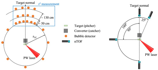 Understanding the underlying neutron production mechanisms and governing parameters requires a thorough characterization of emitted neutrons in terms of directionality, total flux, and energy distribution. For this purpose, a detector setup is designed using bubble and neutron time-of-flight (nTOF) detectors. Figure 5 shows the location of the bubble detectors (left) and nTOF detectors (right) in the laser plane.
