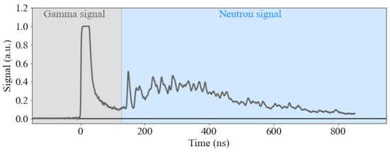 Due to the direct detection of gamma radiation by the scintillator, nTOF detectors are more sensitive to gamma radiation than they are to indirectly detected neutrons. This oftentimes results in the saturation of the detector due to the incident gamma radiation. For directional neutron sources a clear temporal separation between the fast gamma and slower neutron signal (Figure 6) can be achieved for sufficiently large distances between detector and source. Laser-driven neutron beams exhibit quasi-directional to quasi-isotropic neutron emission, which results in neutron fluxes and detected TOF signals decreasing with the square of the distance between source and detector. Consequently, it is usually not possible to place the detector far enough away to achieve clear temporal separation between gamma and neutron signals, as the neutron signal level would drop below or close to the noise threshold. As a compromise, neutron detectors are typically placed –8 m from the interaction, and the exact distance depends on the expected neutron fluxes and the detection efficiency of the detector.