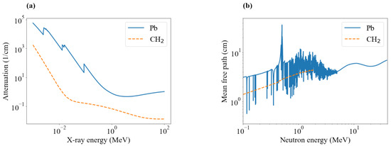 (a): X-ray attenuation coefficient (1/cm) shows superior x-ray attenuation up to three orders of magnitude in lead (Pb) over polyethylene (CH) [104]; (b): Neutron mean free path in lead and polyethylene [79,81,105,106].