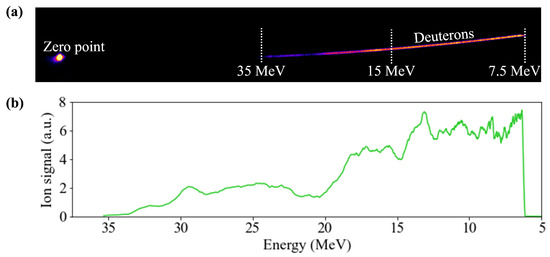 (a) Exemplary raw Thomson parabola trace of accelerated deuteron ion beam at 30 from target normal with integrated signal as a function of deuteron energy (b).