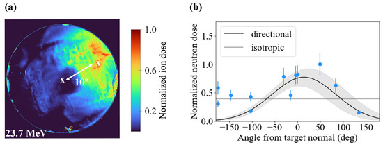 The thickness of the beryllium layer of the converter was adjusted based on the maximum deuteron energy measured in the target normal direction to ensure that all incident deuterons were stopped in the converter. To track the deuteron beam within the converter, RCF layers, Gafchromic MD (260 thick), and EBT (278 thick) films were added to the converter stack at different depths. The deposited ion dose on the RCF layer in the converter is shown in Figure 9a. Its position within the converter stack corresponds to a deuteron energy of 23.7 . Counts were converted into dose using the calibration from Ref. [64], and the deposited dose values normalized to the maximal detected dose are indicated by the color axis. The beam offset was identified to be ∼10° based on the radial symmetry of the deuteron beam edge as observed on the RCF. Assuming a TNSA-like profile, approximately 67% of the ion beam accelerated from the primary target is captured by the converter.