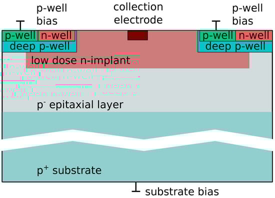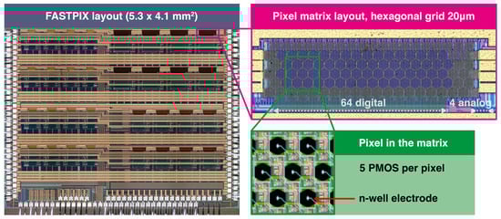 Figure 1 shows a schematic representation of an optimized sensor design. A hexagonal arrangement of the collection electrodes accelerates charge collection at the pixel edges, as the maximum distance within the pixel from the collection electrode is reduced. Moreover, the hexagonal pixel geometry is also favorable for timing and high detection efficiency, due to the reduced number of neighboring pixels, minimizing the charge sharing and therefore increasing the single-pixel signal-to-noise ratio.