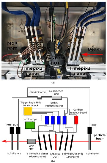 12]. The FASTPIX is mounted in the center of the telescope on an x/y and rotation stage. The MCP-PMT is mounted behind the last downstream plane to minimize the amount of material in the telescope acceptance. One scintillator with a photomultiplier tube is installed before the upstream planes and two are installed behind the MCP-PMT and connected to a coincidence unit, which is connected to a TDC channel of the SPIDR readout.