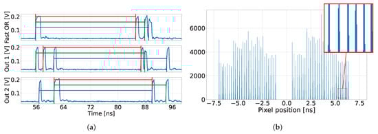 Figure 6a shows the recorded waveforms for an event with 3 pixel hits. Matching pairs of pulses with the same ToT across all 3 channels are connected with a line, and overlap between several pulses is visible.