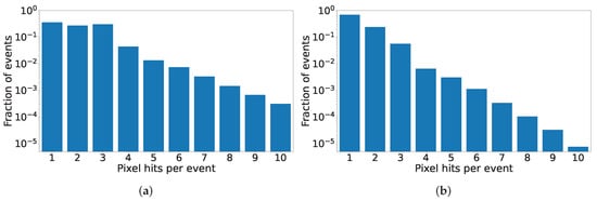 pitch matrix has predominantly a single pixel hit per event, which is the case for 70% of events, and the fraction quickly drops off for more pixels. Moreover, 24% of events have two, and 5% have three pixel hits. The 10