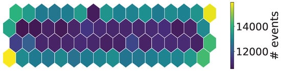 pitch matrix has a similar fraction of single- (35%), two- (27%), and three- (31%) pixel events and then drops off. This shows that the smaller pitch leads to more charge sharing and indicates that the hexagonal layout limits this to mostly three or fewer pixels. Based on TCAD simulations for particles incident in the corner between pixels, an approximately 40% larger single-pixel charge signal is expected for the hexagonal design with 10