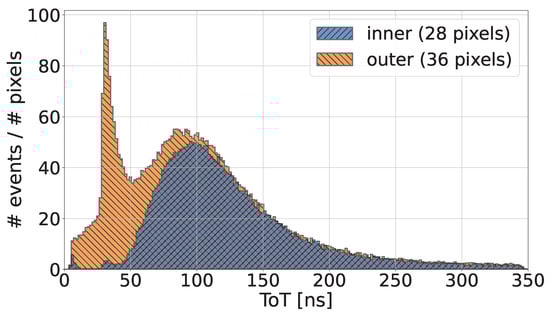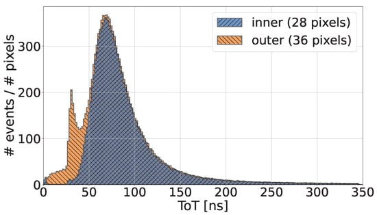 pitch matrix. A larger number of entries is visible for the pixels on the edge of the matrix, which also scales with the number of neighboring dummy pixels that surround the active matrix. The ToT spectrum of the seed pixels split into the inner and outer region can be seen in